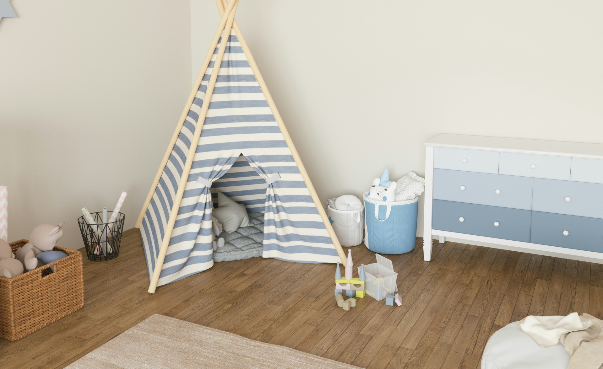 Selvom stilen er minimalistisk, skal rummet stadig afspejle barnets personlighed. Det kan gøres med få, men betydningsfulde detaljer: en yndlingsplakat, et håndlavet tæppe, en samling bøger eller et lille galleri af barnets egne tegninger.